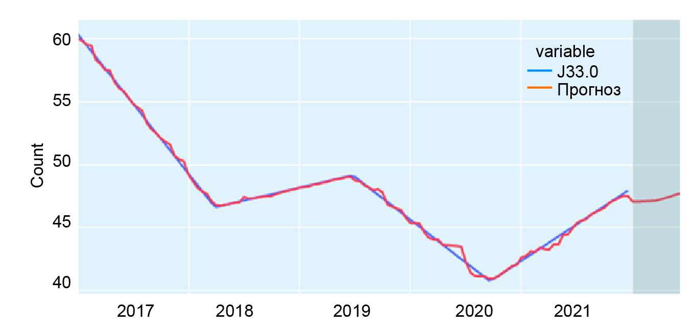 После положительных проверок исходных данных прогноза агрегируемые в среднем по годам диагнозы заболеваемости и распространенности составят временной ряд (таблица 6). Для аппроксимации статической зависимости времени и количества требуется выбор и оценивание параметров модели регрессии по каждому из диагнозов на четырех временных отрезках [7–13]. Для построения прогноза на заданное число шагов требуется динамическая модель фазового движения по траектории прогноза. Но нехватка физических характеристик процесса приводит к неопределению типа уравнения движения. Тогда источник наблюдаемого движения принимаем за «черный ящик», формирующий временной ряд путем генерации последовательно во времени случайных величин. В этой ситуации воспользуемся техникой машинного обучения при аппроксимации формулы движения [14–16]. Для формирования достаточной по объему тестовой выборки (≈20% от обучающей) временной ряд J33.0 (таблица 6) был интерполирован. Далее использовалась модель машинного обучения с автоматическим обучением. Программный код построен с использованием библиотеки машинного обучения PyCaret (Python). Для достижения оптимальной точности прогноза применялась модель на обучающих данных Random Forest Regressor. Выбираем шаги прогноза в интервале ФОРМУЛА от периода года.