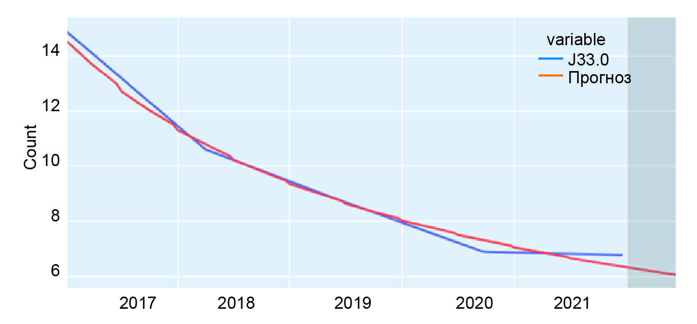 Рисунок 4. Регрессия и прогноз распространенности заболевания, диагноз J33.0.