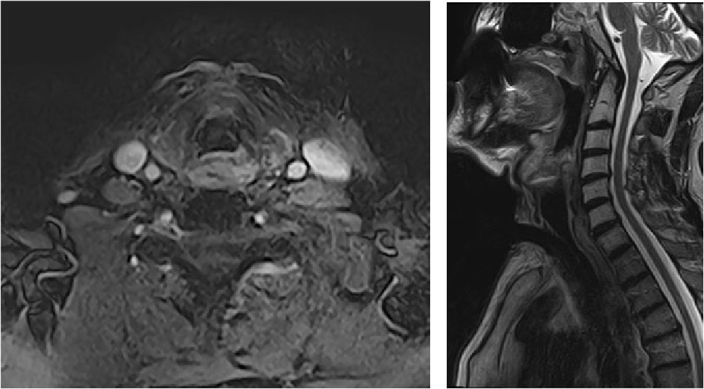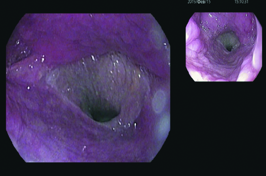 Patient N., aged 48 years, complained of impaired respiratory function, inability to swallow food, and loss of speech. Anamnesis revealed that in 2002, she was diagnosed with cancer of the folded section of the larynx T2N0M0. Condition after chemoradiotherapy. Progression in September 2018. During further examination, she was diagnosed with cancer of the laryngopharynx T2N0M0. Histologically, a squamous highly differentiated carcinoma was detected. Because of the development of clinical signs of acute respiratory failure, an emergency tracheostomy was performed in November 2018. Two courses of induction polychemotherapy were completed with negative dynamics. Computed tomography and endoscopic examination revealed that the tumor involved the laryngopharynx and cervical esophagus with complete obliteration of its lumen, with transition to the laryngeal posterior segments (Fig. 1).