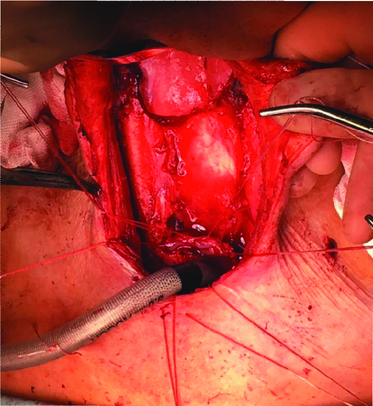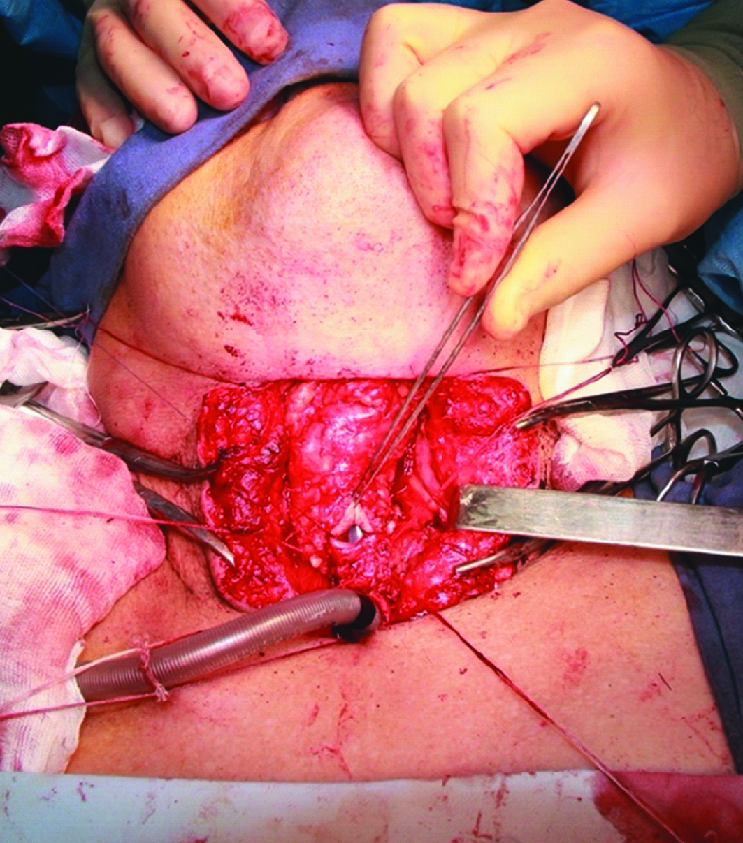 Figure 3. View of the wound on the neck after extirpation: pharynx and cervical esophagus are removed, at the bottom of the wound is the prevertebral fascia. In the upper section of the wound, the borders of the pharynx are visualized, in the lower section of the wound – the remaining part of the esophagus
