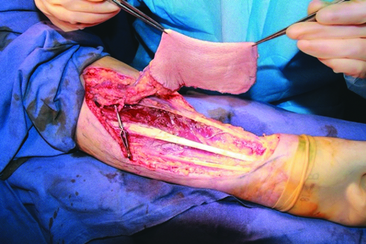 Рисунок 4. Выделение лучевого лоскута, выделены лучевая артерия и вена.