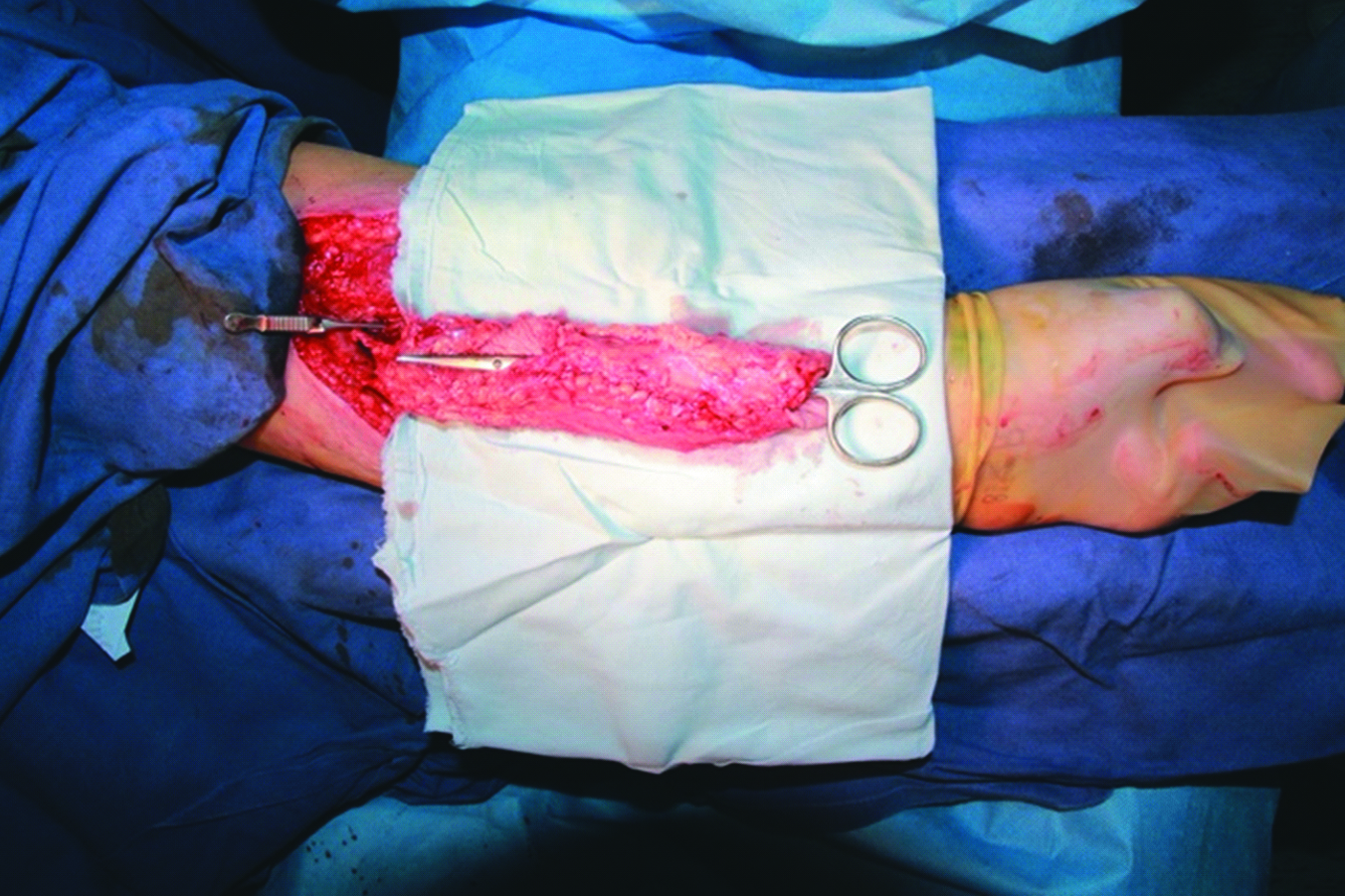 Figure 4. Radial flap dissection, radial artery and vein are tagged