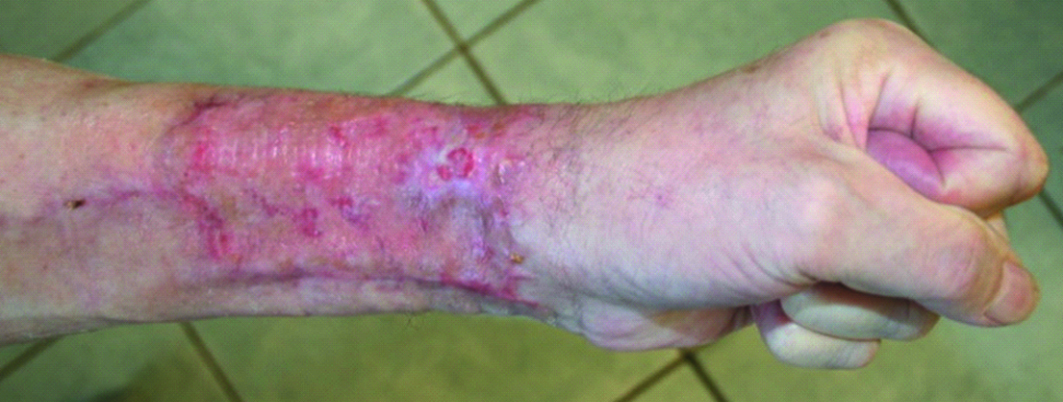 The postoperative period was uneventful. Complete flap healing was observed. The donor site wound was eliminated with autodermoplasty. The wound at the recipient site healed by primary intention (Fig. 7).
