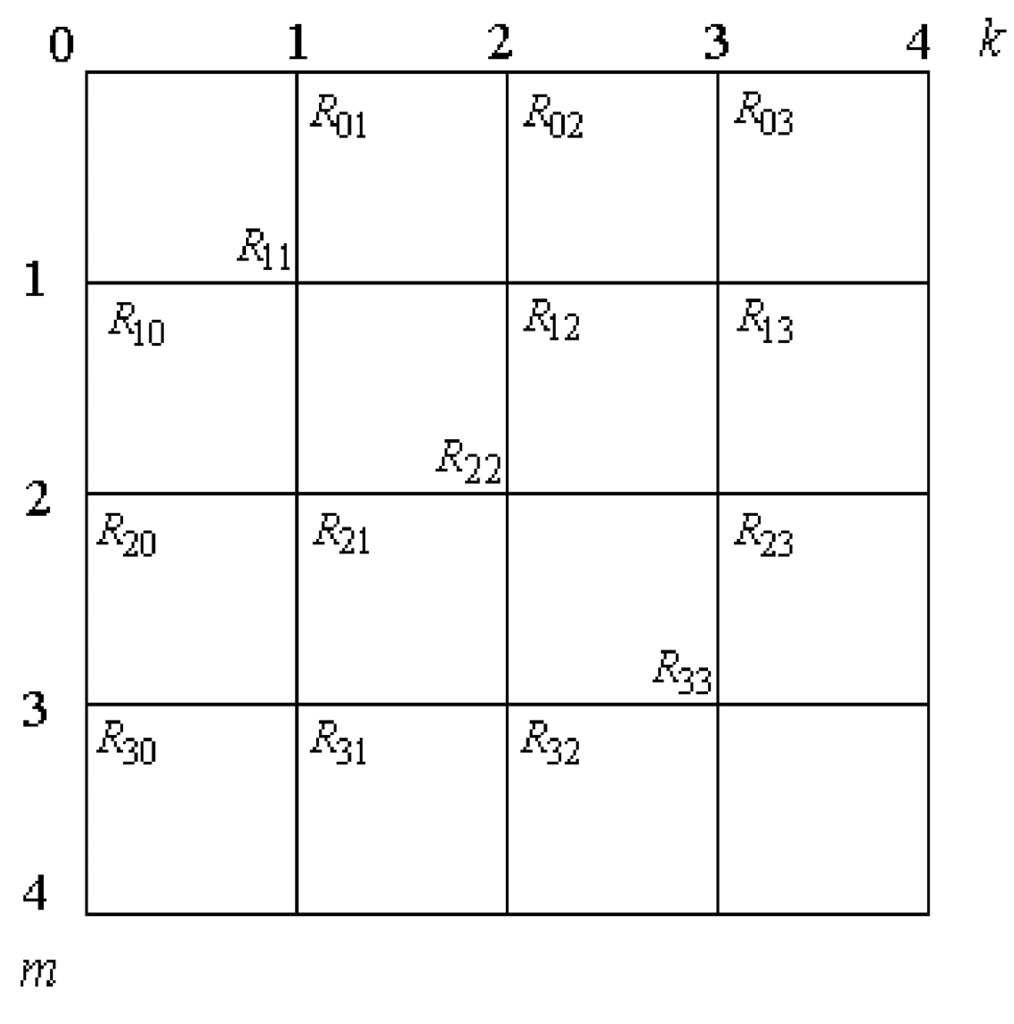 где mm – номер узла относительно вертикали m и горизонтали k, при k=m (рисунок 1).