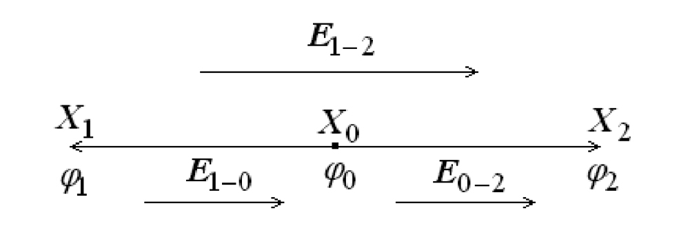 Формула (34) отражает баланс напряженностей электрического поля E1-2= E1-0+ E0-2. Учитывая симметрию схемы (рисунок 2), можно записать E1-2= 2E0-2 или ∆ϕ1-2 = 2∆ϕ0-2, а формулу (32) использовать в виде: