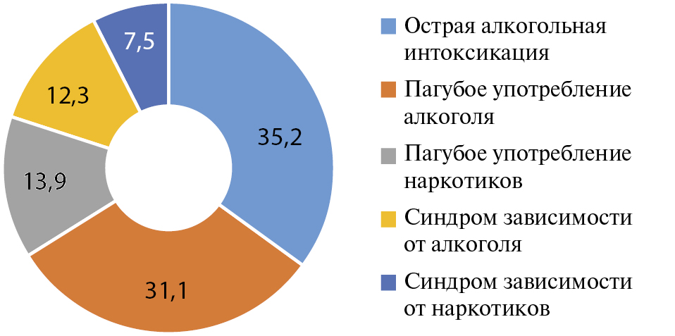 Из всех кандидатов в водители никогда ранее не попадали в поле зрения наркологов 30,6%. Соответственно наблюдались у наркологов с различными диагнозами 69,4% обследованных кандидатов в водители. Около четверти (24,2%) из группы наблюдавшихся у нарколога составили лица без выявленной наркологической патологии, наблюдавшиеся в консультативной группе вследствие выявленного в ходе медицинского освидетельствования алкогольного опьянения. Остальные 75,8%, или 122 человека, имели определенный наркологический анамнез: 35,2% – острую алкогольную интоксикацию (код F10.0 по Международной классификации болезни Х пересмотра), 31,1% – пагубное употребление алкоголя (F10.1), 13,9% – пагубное употребление наркотиков (F11–F19 c общим четвертым знаком.1), 12,3% – синдром зависимости от алкоголя (F10.2) и 7,5% – синдром зависимости от наркотиков (F11–F19 c общим четвертым знаком.2).