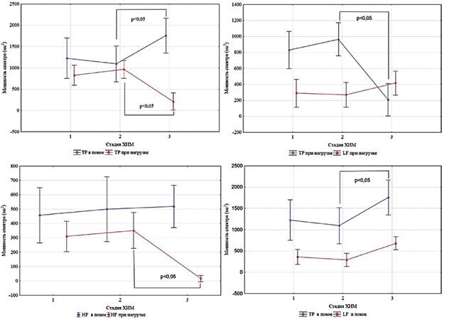 Для определения характера выявленных изменений проведен сравнительный анализ по показателям мощности отдельных спектров для независимых групп (критерий Краскела – Уоллиса). Отмечается значительное возрастание мощности VLF, преимущественно при выполнении пробы с изометрической нагрузкой. Достоверные различия по мощности этого спектра появляются при сравнении пациентов с III стадией ХИМ относительно пациентов с I и II стадиями.