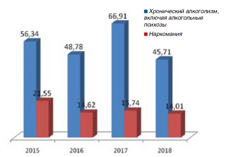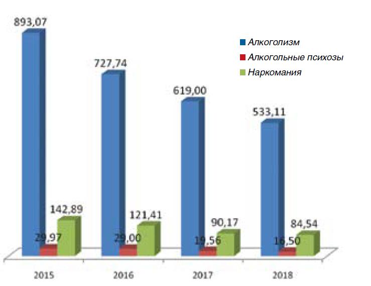 Выраженная тенденция по снижению эпидемиологических показателей, отражающих тяжесть наркологической ситуации, типичная для большинства регионов России, также характерна для сельских районов Самарской области [4]. Так, количество зарегистрированных больных алкоголизмом, алкогольными психозами и наркоманиями в сельских районах Самарской области сократилось с 1065,9 (на 100 тыс. населения) в 2015 году до 634,2 в 2018 году (снижение на 40,5%). Основное количество пациентов, зарегистрированных в изучаемый период, – это больные алкоголизмом, алкогольными психозами (84,6% от общего числа зарегистрированных). На больных наркоманией и лиц, злоупотребляющих наркотиками, пришлось 15,4%.