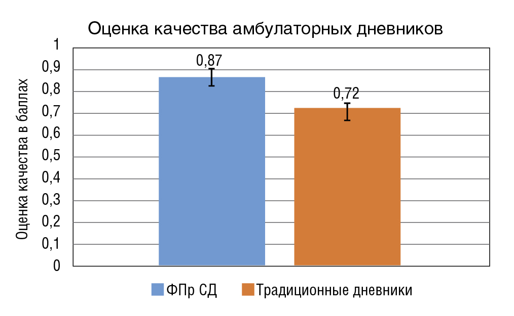 Среднее значение оценки качества амбулаторных дневников, заполненных с применением ФПр СД, составило 0,87±0,02 балла, коэффициент качества «хорошо» (качественно оказанная медицинская помощь). В группе пациентов, чьи амбулаторные дневники заполнялись традиционным способом, средняя оценка качества была ниже, составив 0,72±0,03 балла, коэффициент качества «удовлетворительно» (качественно оказанная медицинская помощь, сопровождавшаяся единичными дефектами, которые не привели к ухудшению здоровья пациента). Различия показателей были статистически значимы (p<0,05) (рисунок 5).