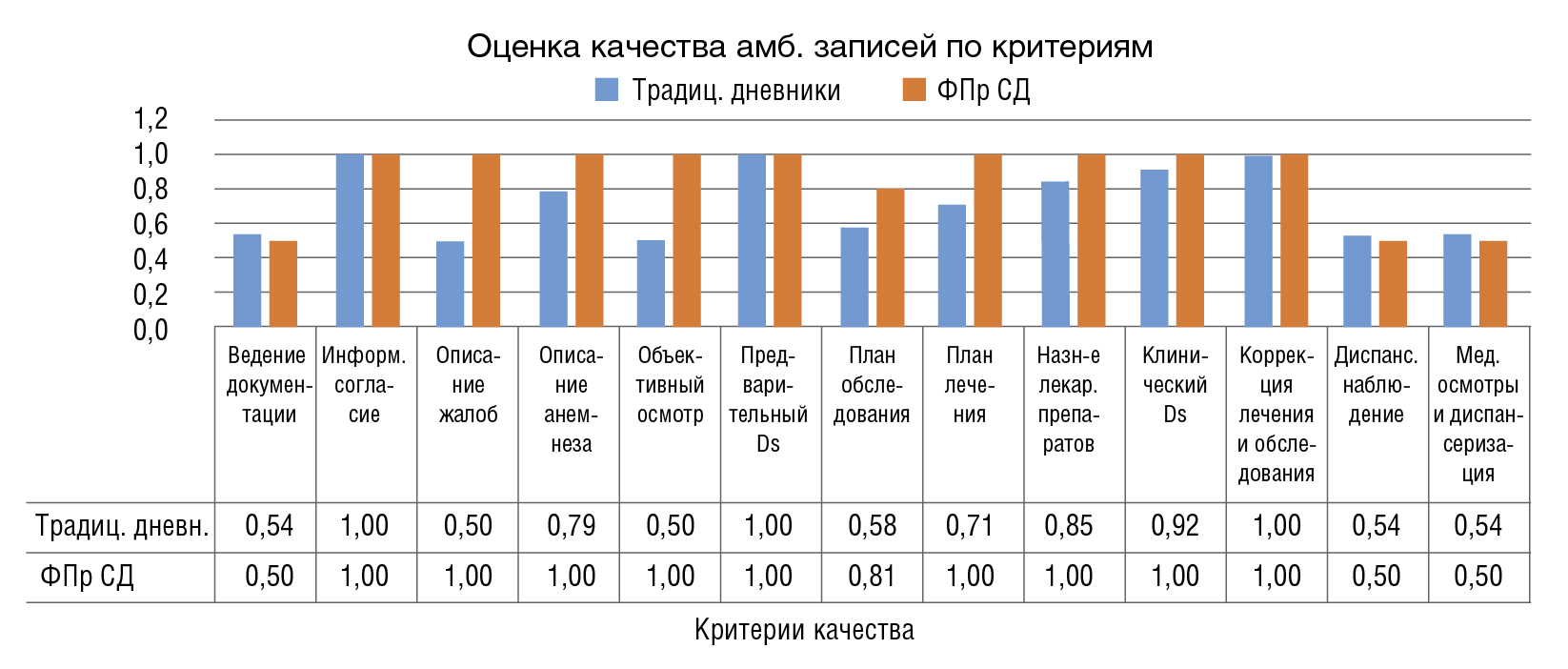 При анализе данных ВКК записей в амбулаторной карте обращает на себя внимание монотонность вариационного ряда коэффициентов качества: для традиционных дневников от 0,64 до 0,75 («удовлетворительно»), для ФПр СД от 0,85 до 0,89 («хорошо»). Это связано с порядком заполнения Карты ВКК, согласно которому баллы по каждому критерию выставляются дискретно: 0 – раздел не заполнен; 0,5 – раздел заполнен частично, что не повлияло на исход заболевания; 1,0 – раздел заполнен в полном объеме. Средняя оценка качества по каждому из использованных критериев представлена на рисунке 6.
