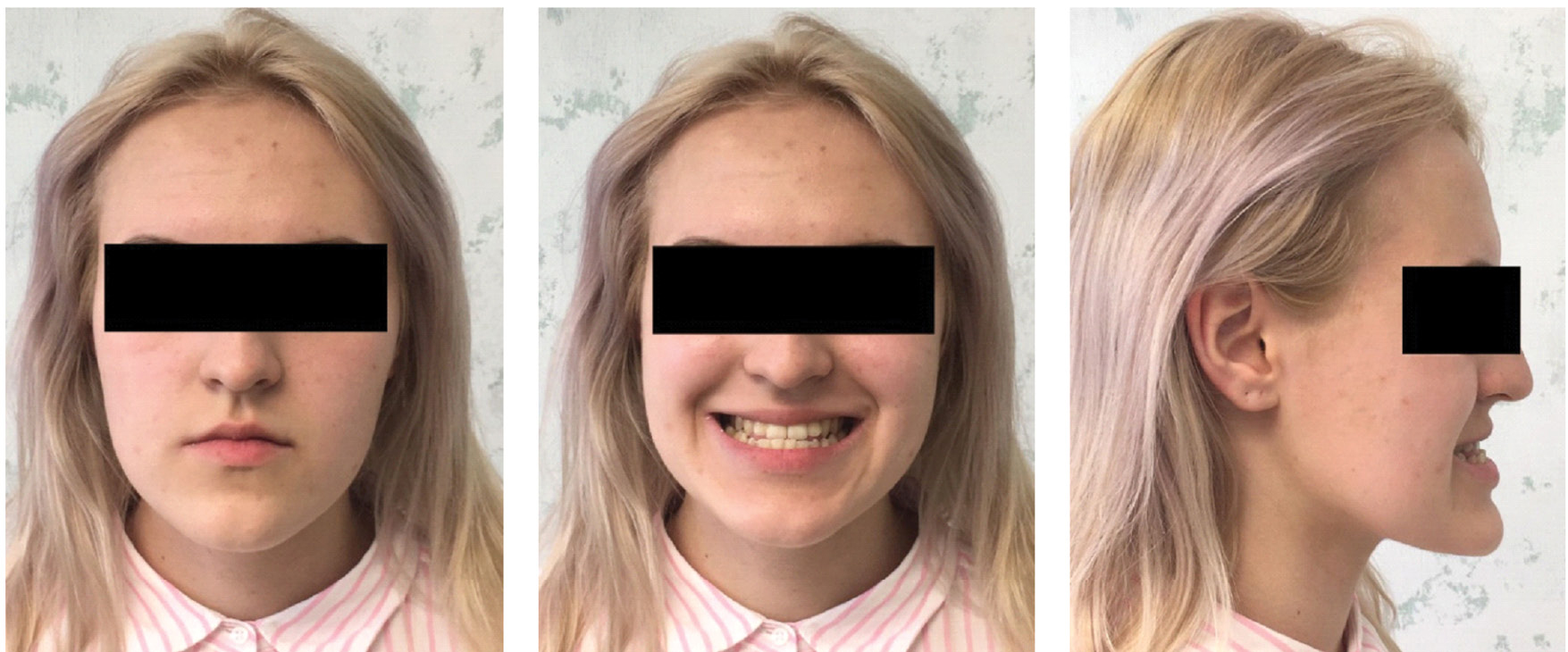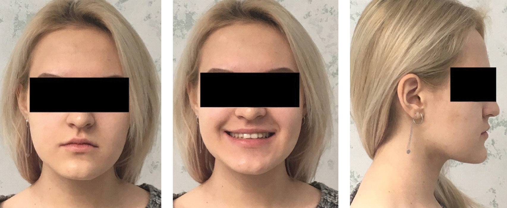 Рисунок 1. Лицо, улыбка, профиль пациентки Т., 18 лет, с мезиальной окклюзией гнатической формы до операции на нижней челюсти.