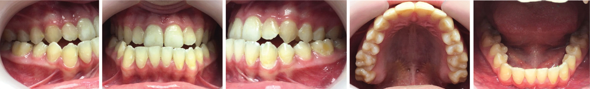 Рисунок 2. Смыкание зубных рядов (слева, спереди, справа), верхний и нижний зубные ряды пациентки Т., 18 лет, с мезиальной окклюзией гнатической формы до операции на нижней челюсти.