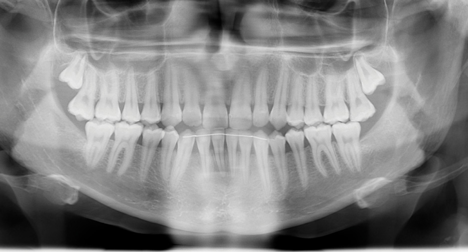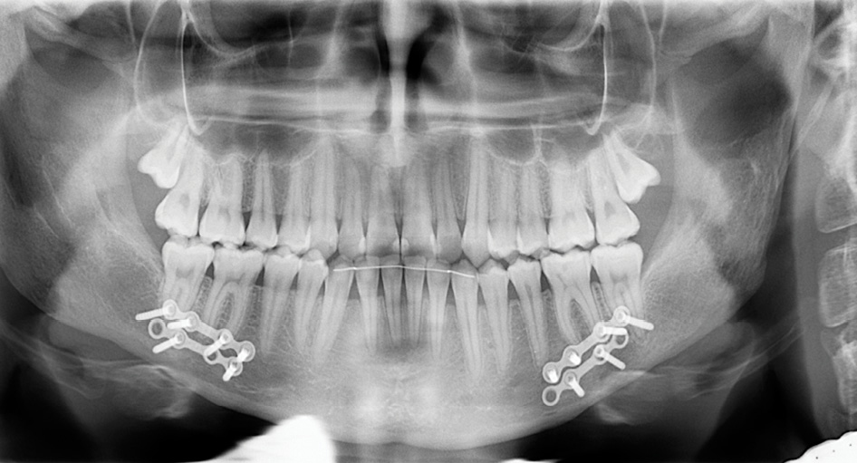 Рисунок 8. Ортопантомограмма пациентки Т., 18 лет, с мезиальной окклюзией гнатической формы после операции на нижней челюсти.