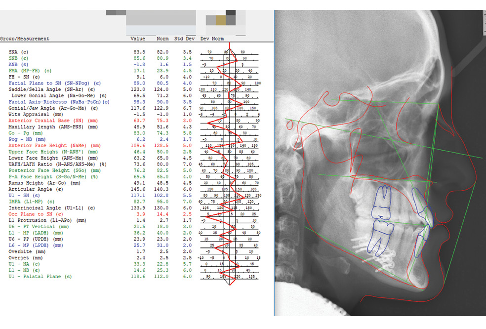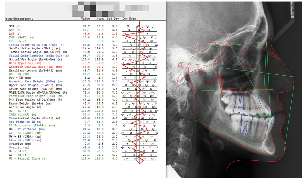 Проведены визуализация и анализ цефалометрических параметров челюстно-лицевой области у пациентки с гнатической формой мезиальной окклюзии при помощи метода ортопантомографии (ОПТГ) и телерентгенографии (ТРГ) с последующей расшифровкой полученного изображения в программе Dolphin Imaging (США). Далее применяли ультразвуковую допплерографию (УЗДГ) сосудов головы и шеи на аппарате Philips HD 15.