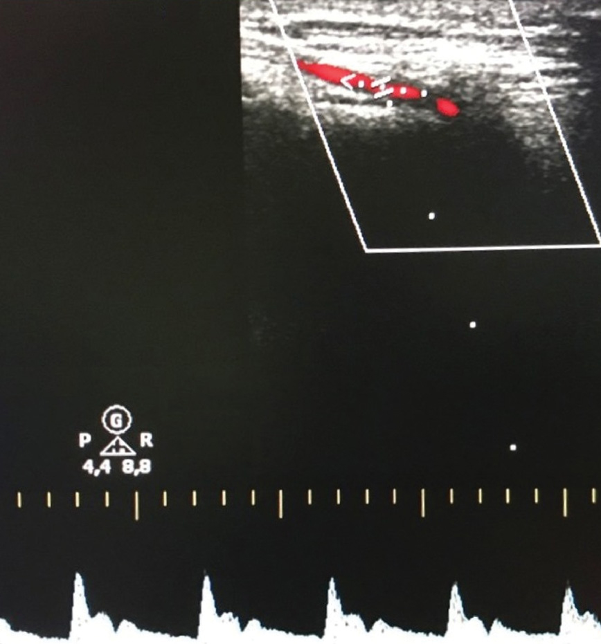 В ходе исследования в цветовом допплеровском режиме у пациентки оценивали следующие параметры: наличие цветовой картограммы потока; однородность заполнения просвета сосуда цветом (наличие зон турбулентности); равномерность заполнения просвета сосуда цветом (наличие дефектов заполнения на цветовой картограмме, патологического расширения цветовой картограммы). Также исследование проводилось в спектральном допплеровском режиме, что позволило получить объективную количественную информацию о наличии и характере изменения показателей локальной гемодинамики, таких как систолическая скорость кровотока (Vs), диастолическая скорость кровотока (Vd), индекс резистентности (индекс Пурсело, RI). В B-режиме выявляли препятствия в виде сосудистых мальформаций, которые влияют на кровоток, и измеряли диаметр (d) сосудов.