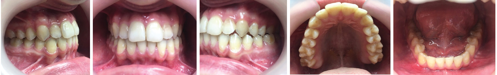 Рисунок 7. Смыкание зубных рядов (слева, спереди, справа), верхний и нижний зубные ряды пациентки Т., 18 лет, с мезиальной окклюзией гнатической формы после операции.