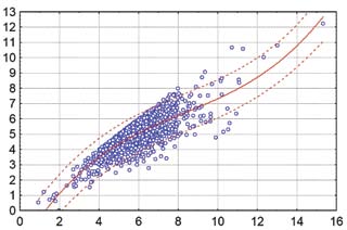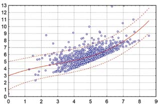 Примечание: Здесь и на рисунке 2 по оси абсцисс – концентрация этанола в моче, ‰; по оси ординат – этанолемия, ‰. Знаком ï маркированы выборочные данные; сплошной линией – кривая регрессии, пунктирными линиями – физиологические пределы этанолемии для 95% доверительной вероятности.