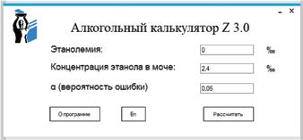Для удобного применения установленных закономерностей на практике без осуществления трудоемких матричных операций и иных вычислительных процедур авторами на языке программирования С# была также разработана программа «Алкогольный калькулятор Z 3.0» объемом 1,3 Мб, реализующая комплекс полученных выражений (1–4) в операционной среде Windows (свидетельство о государственной регистрации программы для ЭВМ №2020611447).