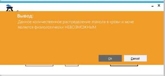 Рисунок 4. Один из возможных результатов программы «Алкогольный калькулятор Z 3.0», демонстрирующий вывод о физиологическом несоответствии заданного количественного распределения этанола в крови и моче.
