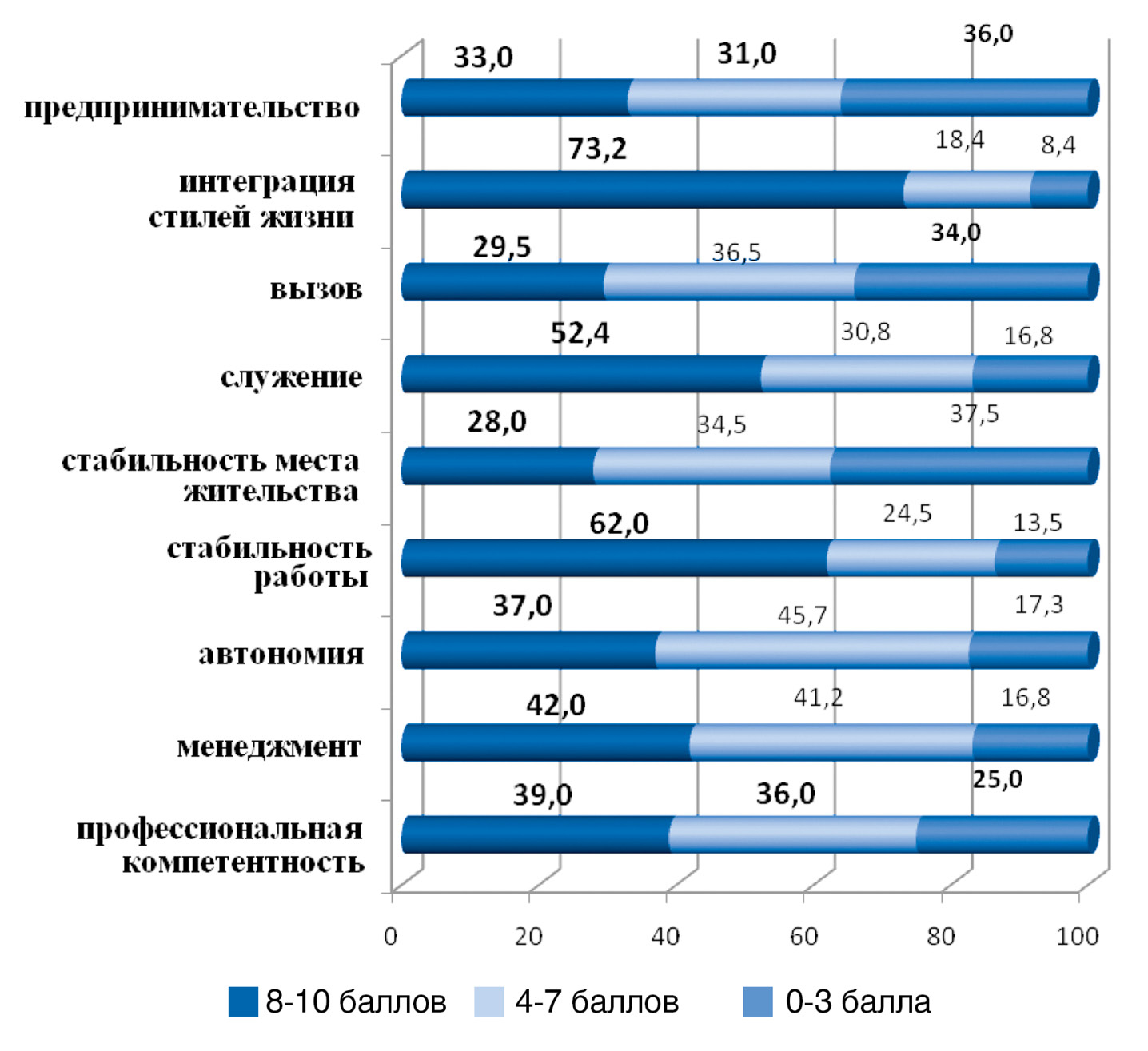 Важным аспектом в первую очередь внутренней, но отчасти и внешней мотивации является наличие определенных «прогнозов и ожиданий» от жизни вообще и профессиональной деятельности в частности. Для их анализа использовалась методика диагностики ценностных ориентаций в карьере «Якоря карьеры» (методика Э. Шейна в адаптации В.А. Чикер и В.Э. Винокурова). «Якоря карьеры» – это социально обусловленные побуждения к деятельности, характерные для определенного человека (ценностные ориентации, социальные установки, интересы и т.п.). Предлагаемый в методике тест состоит из 41 вопроса. Испытуемым необходимо на каждый вопрос поставить оценку от 1 до 10 (1 – абсолютно не важно, 10 – исключительно важно). Тест позволяет выявить следующие карьерные ориентации: профессиональная компетентность, менеджмент, автономия, стабильность работы, стабильность места жительства, служение, вызов, интеграция стилей жизни, предпринимательство. По каждой ориентации высчитывается средний балл. Самое высокое его значение может равняться 10, а самое низкое – 1.