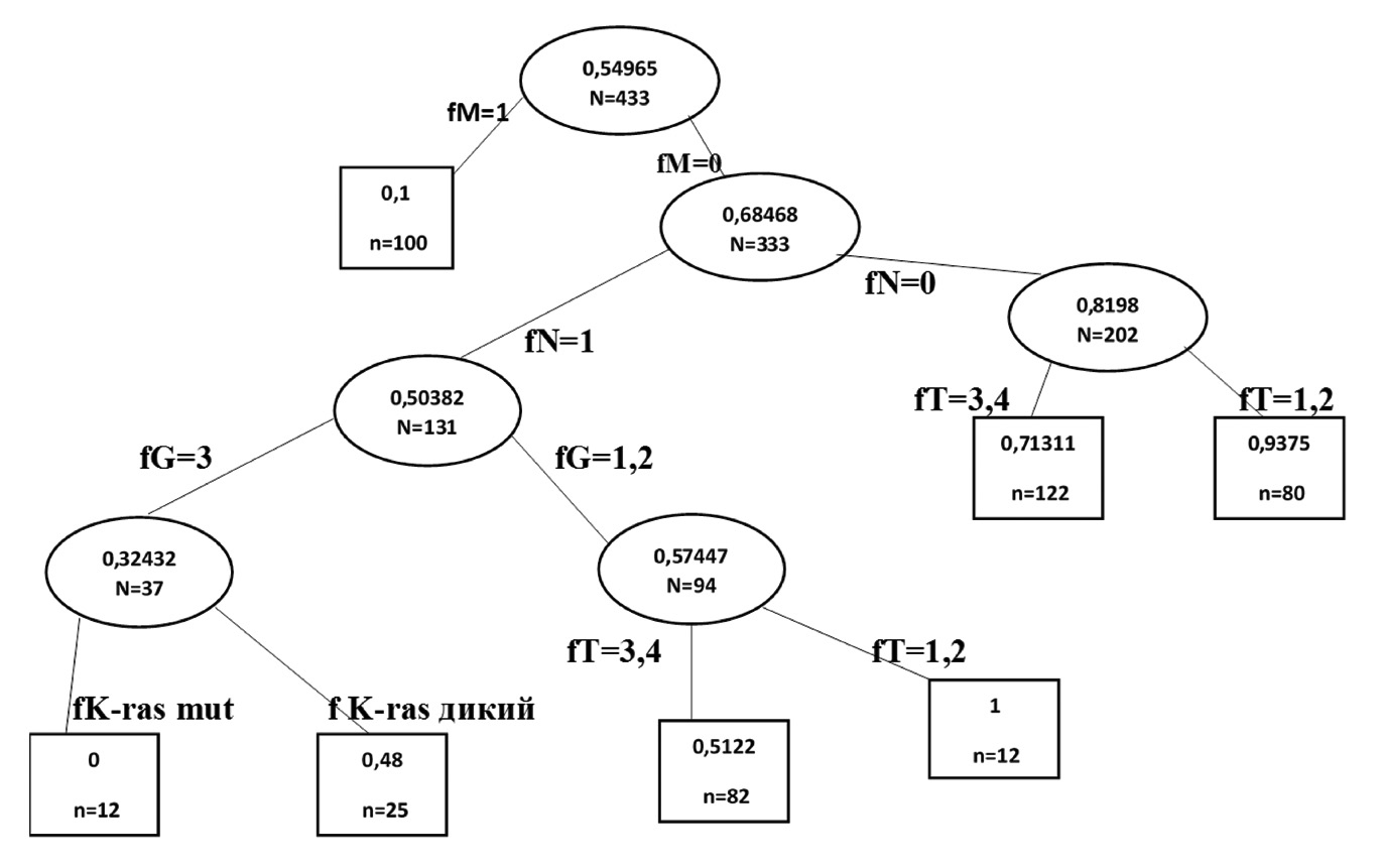 Note. fМ = 0 - distant metastases are absent. fМ = 1 - presence of distant metastases. fN = 0 - regional metastases are absent. fN = 1 - the presence of regional metastases. fG = 1 - low-grade differentiated adenocarcinoma. fG = 2 - moderately differentiated adenocarcinoma. fG = 3 - high-grade differentiated adenocarcinoma. fТ = 1, fТ = 2, fТ = 3, fТ = 4 - the degree of tumor penetration into the intestinal wall. fMutStatus = 1 - K-ras gene mutation, fMutStatus = 2 - “wild” type of K-ras gene. fAge = 1 - patients’ age up to 50 years, fAge = 2 - 50 to 69 years of age, fAge = 3 - over 70 years of age.