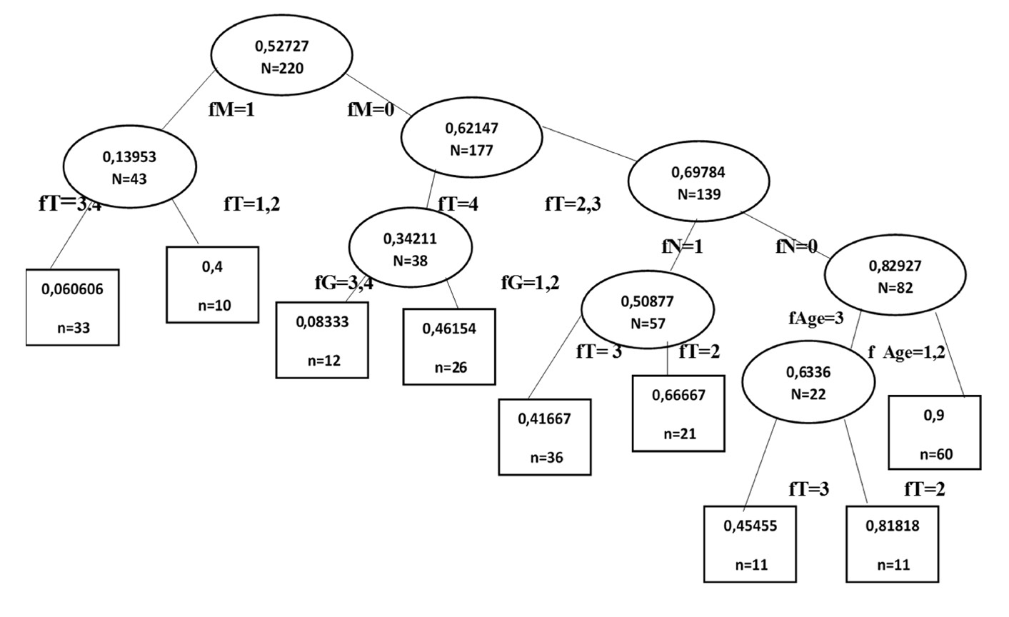 Figure 1 shows that long-term results of 433 male CRC patients at the top of the tree were studied. The left branch implies the presence of distant metastases (M+), which includes 100 patients. They have a 10% chance of living of 5 years. This prognosis cannot be improved using other variables (terminal top). The right branch implies the absence of distant metastases (M0), which includes 333 patients with a 5-year survival rate of 68.4%.