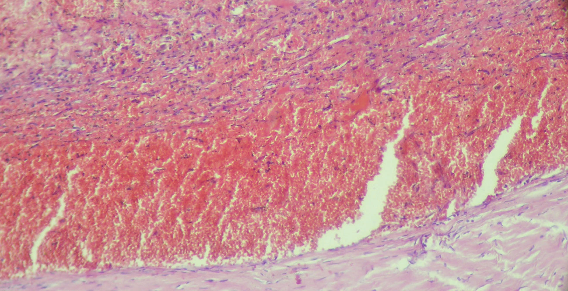Рисунок 2. Капсула СГ с наличием множественных ВИК. Отмечается слияние ВИК с отслоением капсулы от ТМО и формированием интракапсулярной полости, заполненной кровью. Окраска гематоксилином и эозином. 129х.