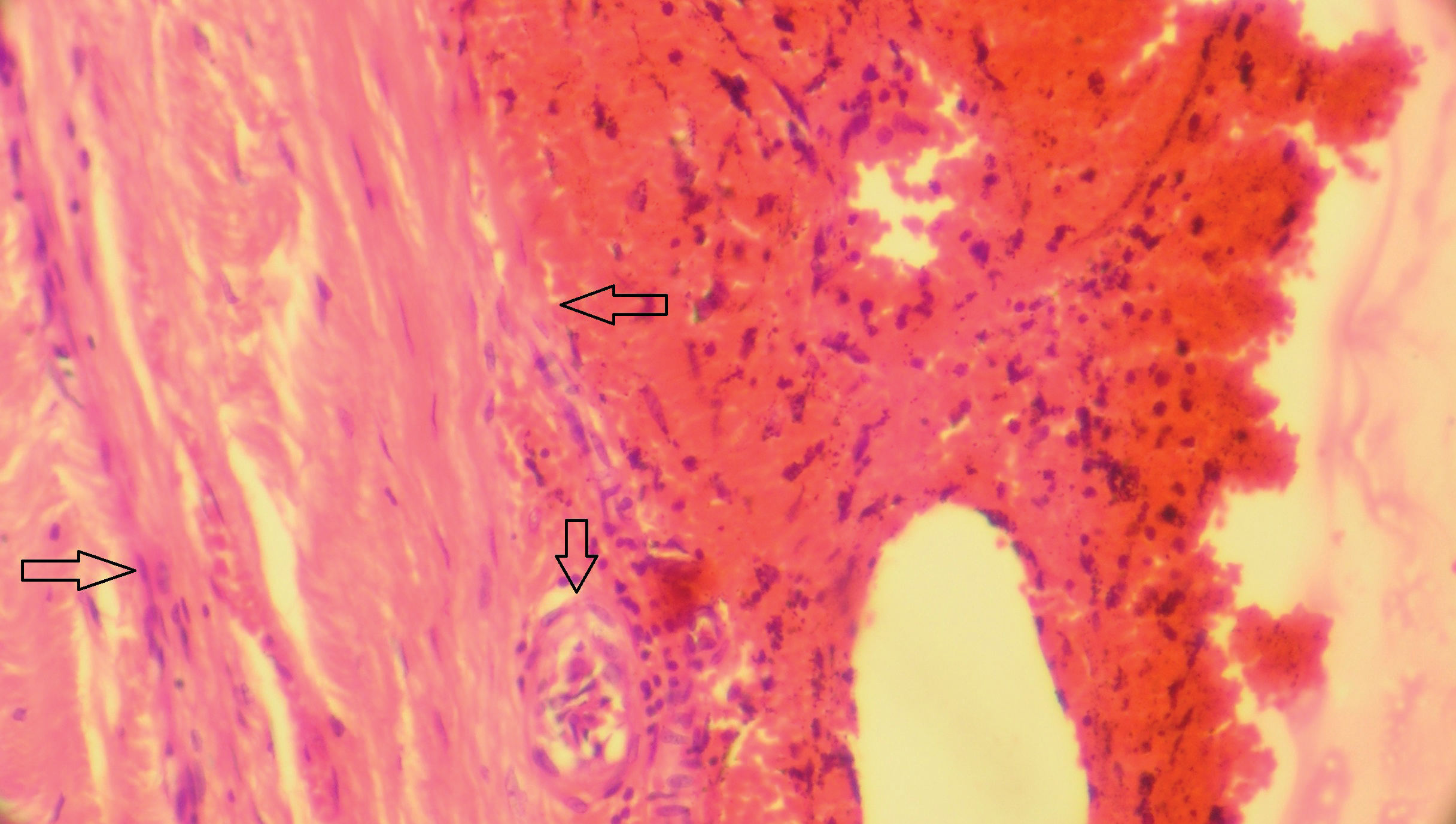 Третью группу образуют артифициально резорбированные гематомы, не достигшие стадии стабильной организации. СГ этого подкласса подвергаются эвакуации уже после своей инкапсуляции, но до того как морфологическое строение их капсул по степени развития инволютивно-дистрофических и репаративных процессов начинает соответствовать таковому стабильно организованных гематом. Морфологически капсулы артифициально резорбированных СГ неотличимы от таковых их инкапсулированных аналогов (рисунок 5), отсутствие наложений крови на поверхности которых может быть вызвано процессами частичной резорбции или быть артефактом гистологической техники [4]. В патогенетическом аспекте следует отметить, что артифициально резорбированные СГ являются нестабильными, способными снова переходить в класс инкапсулированных гематом путем развития ВИК и последующего расслоения капсулы. Именно по причине своей нестабильности данный тип СГ, несмотря на отсутствие у них содержимого, нельзя относить к остаточным изменениям, а их давность должна определяться методами, предназначенными для первично инкапсулированных гематом.