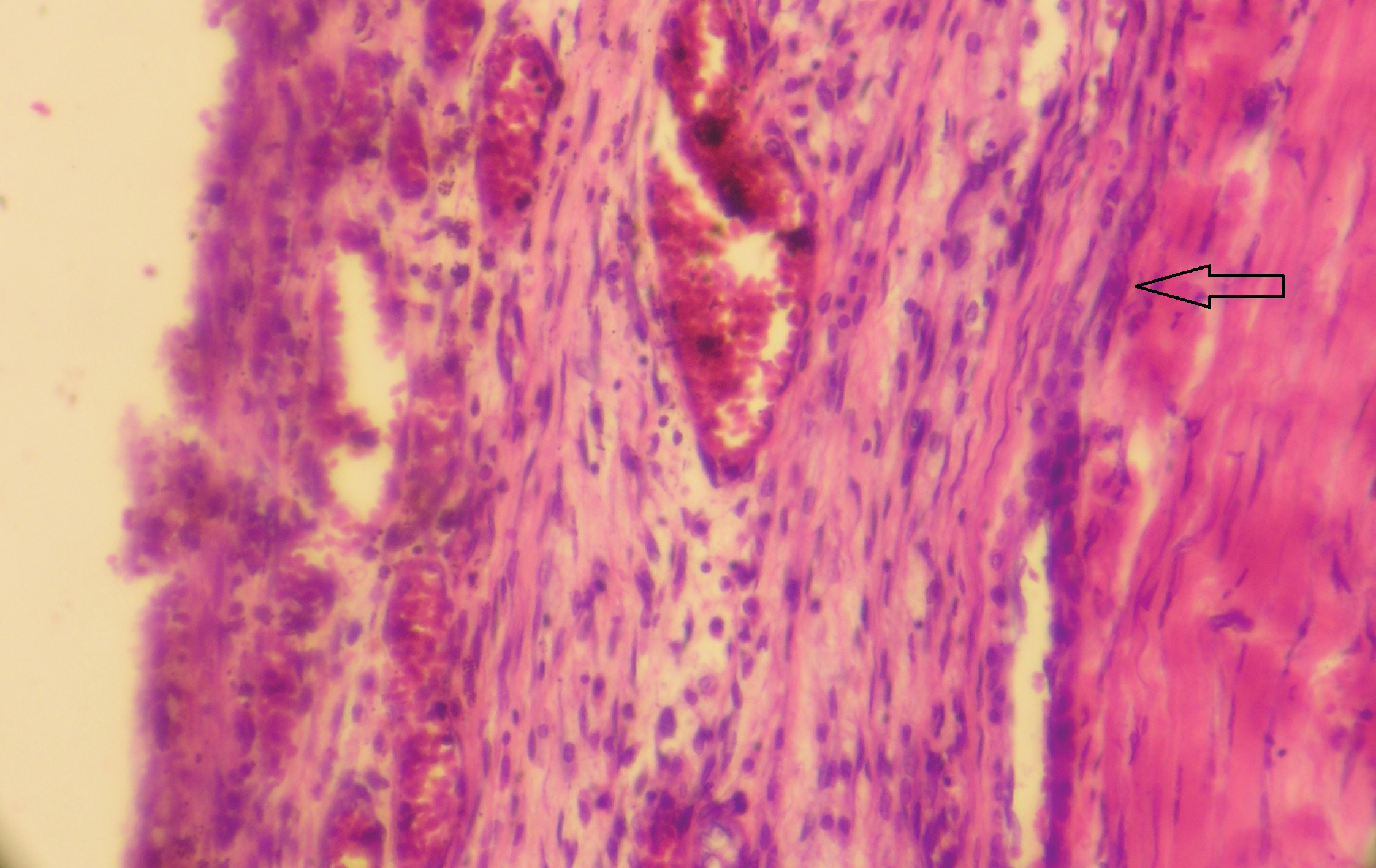 Рисунок 5. Артифициально резорбированная СГ. Граница между капсулой гематомы и ТМО отмечена стрелкой. Окраска гематоксилином и эозином. 129х.