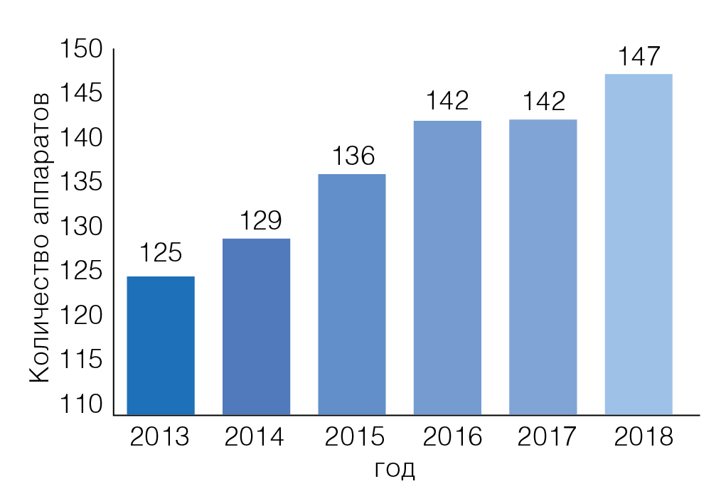 Рисунок 1. Динамика количества цифровых аппаратов для исследований органов грудной клетки (цифровые флюорографы) в учреждениях здравоохранения Санкт-Петербурга в период с 2013 по 2018 год.