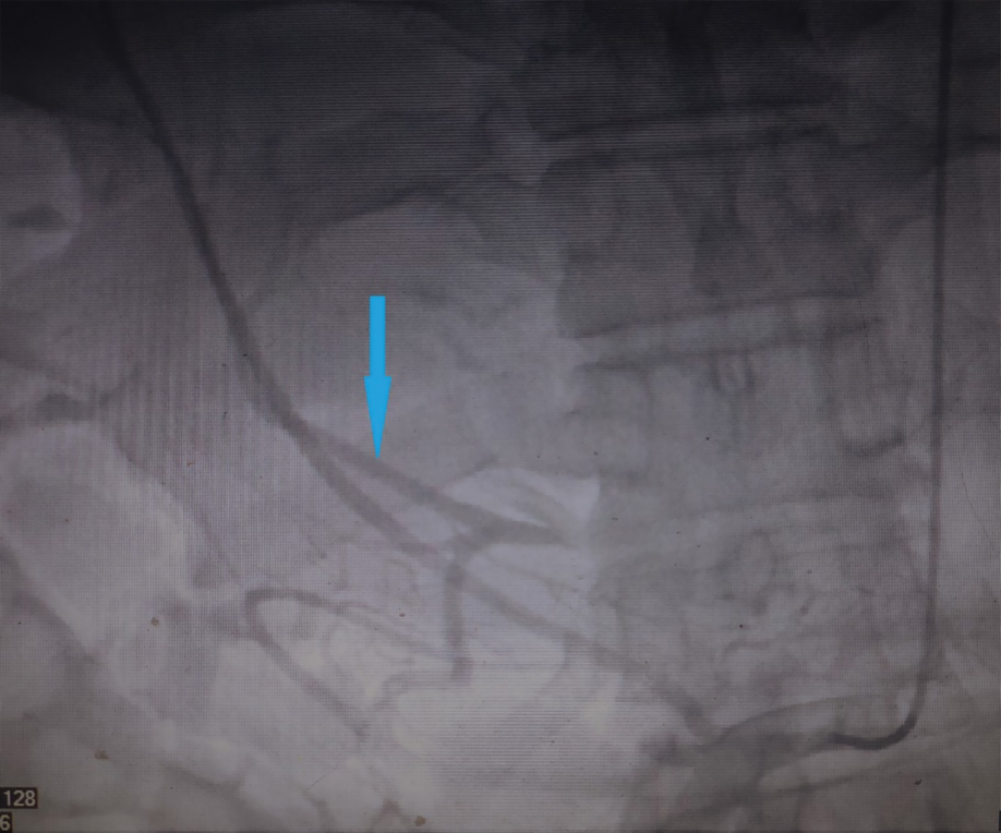 The arrow indicates the right hepatic artery where autologous mesenchymal stem cells were implanted.