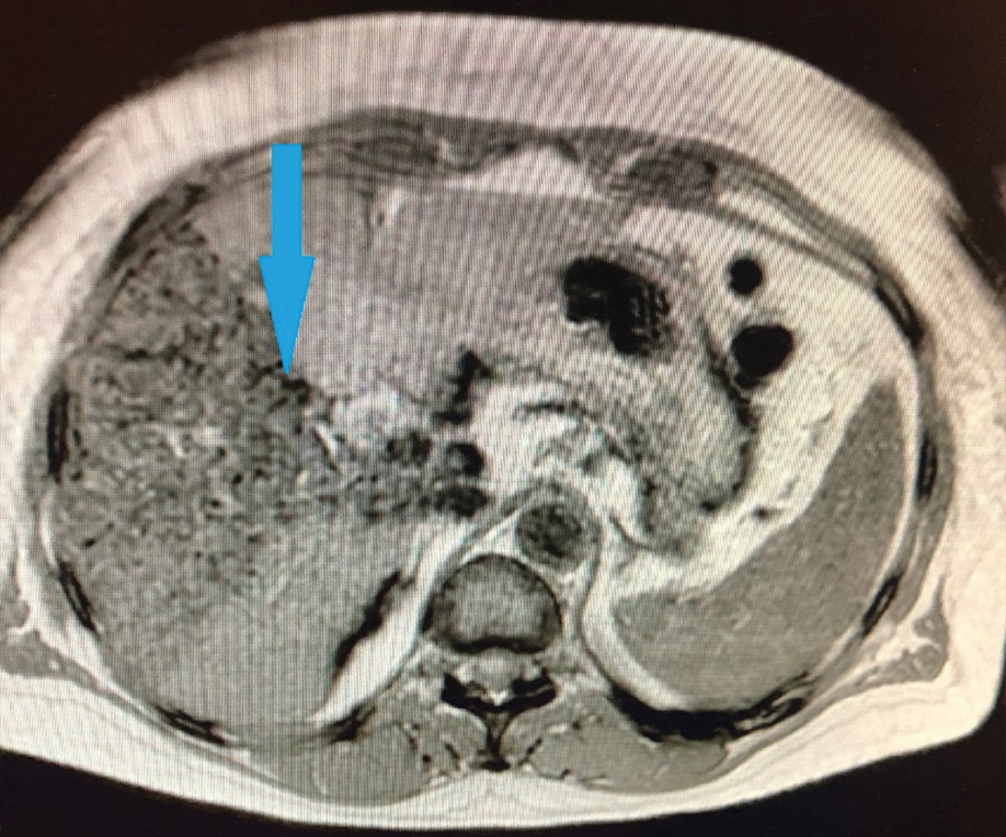 Figure 2. Magnetic resonance imaging of abdominal organs on 1 day after the insertion of autologous mesenchymal stem cells into the arterial bed of the liver. The arrow indicates the areas of the liver where the marked stem cells are visualized.