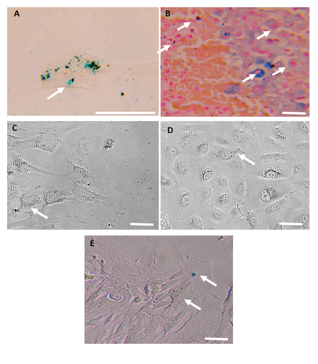 Рисунок 4. Исследование локализации IONP в клетках методом микроскопии препаратов, окрашенных гексацианоферратом железа (А, B, E) и неокрашенных (C, D): (А) в МСК после обработки IONP, 300 мкг/мл перед трансплантацией; (B) в клетках гистологического препарата биоптата печени, полученного через 6 месяцев после трансплантации; (С–D) в первичных культурах клеток биоптата до первого пересева (С – фибробластоподобная колония, D – пителиоподобная колония) и после 2 пересевов (Е). Масштабный отрезок – 50 мкм. Стрелками отмечены некоторые из IONP.