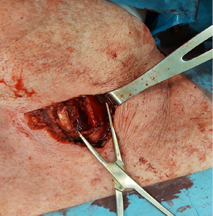 Контрольной группе (исторического контроля) из 51 человека проведены открытые резекции (ОР) гортани «ларингофиссура» с нарушением целостности щитовидного хряща (рисунок 1). Больным основной группы – 46 человек – выполнены эндоларингеальные резекции (ЭР) с использованием эндоскопической стойки, подвесной системы, ларингоскопа, набора жестких эндоскопов 0, 30, 45 градусов, электрохирургических и эндоларингеальных инструментов (рисунок 2).