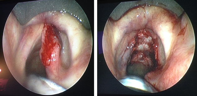 Figure 2. Endolaryngeal view before and after resection of vocal fold.