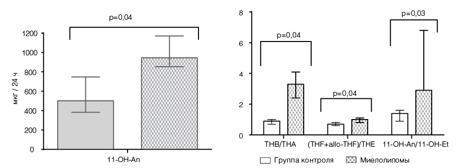 Рисунок 2. Экскреция с мочой 11-гидроксиандростерона (11-ОН-An – 5á-метаболита андростендиона) и признаки снижения активности 11â-НСД 2 типа (соотношение THB (тетрагидрокортикостерона) / ТНА (тетрагидро-11-дегидрокортикостерона; THF (тетрагидрокортизол)+alloTHF/THE (тетрагидрокортизон) и увеличения активности 5á-редуктазы (11-ОН-Аn (11-гидроксиандростерон) / 11-OH-Et (11-гидроксиэтиохоланолон) у больных с миелолипомой по данным газовой хромато-масс-спектрометрии.
