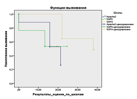 В нашем исследовании шкала MODS не дала никаких результатов, поэтому была признана неэффективной. Шкалы APACHE II и SAPS также достоверно не отражали состояние пациентов, прогноз летальности по шкале SOFA был более объективным.