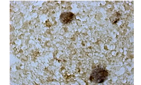 Рисунок 4. Мазок – отпечаток ожоговой раны пациента группы сравнения, 12-е сутки. Единичные макрофаги с гранулами эстеразы. ИЦХ. Реакция a-нафтилацетатом. (х40).