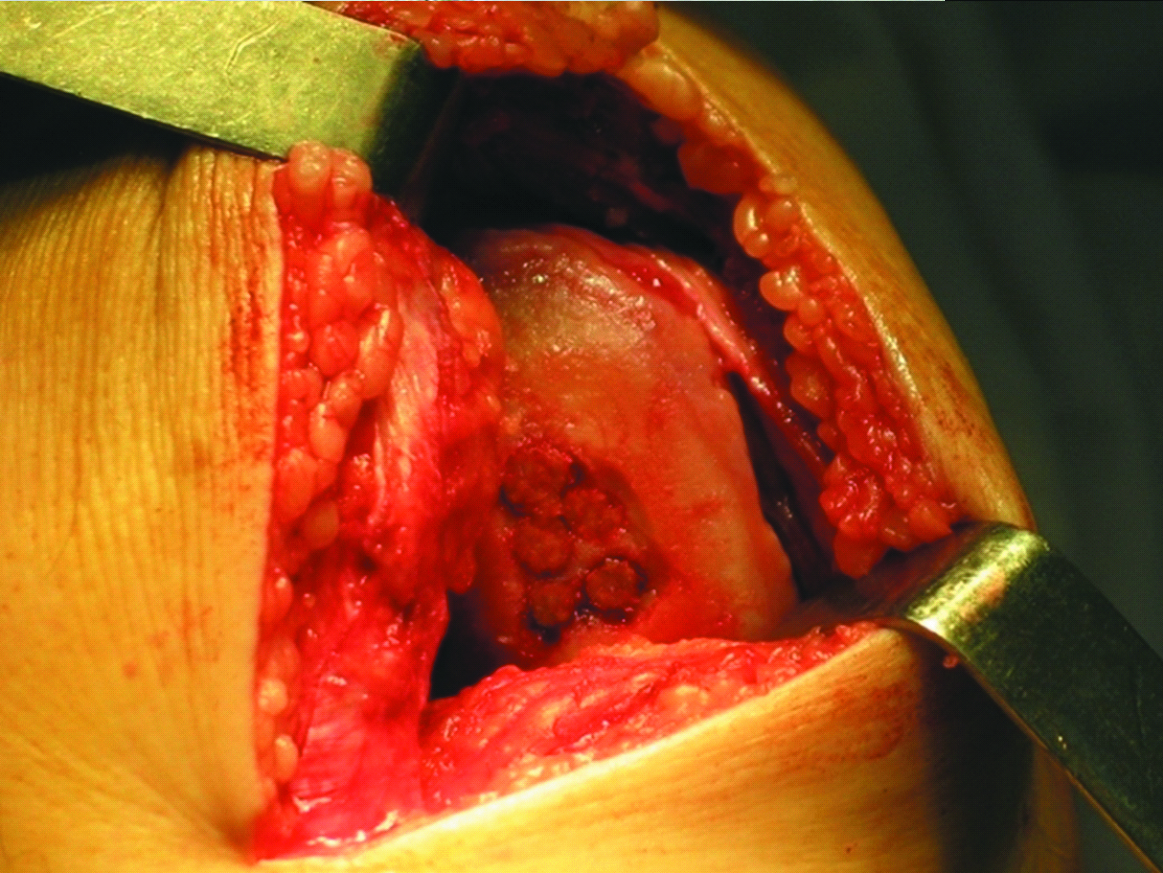 Figure 4. Intraoperative view of the defect area after chondroplasty with spongy bone autografts impregnated with a suspension of in vitro cultured autologous chondrocytes.
