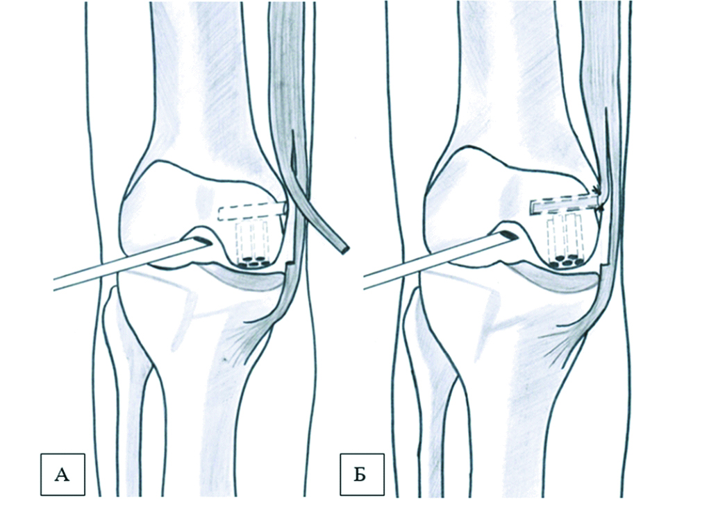 Рисунок 5. Схема выполнения этапа миопластики при использовании видеоартроскопии: формирование канала в метафизарной кости мыщелка бедра для мышечного лоскута (А) и проведение мышечного лоскута в сформированном канале (Б).