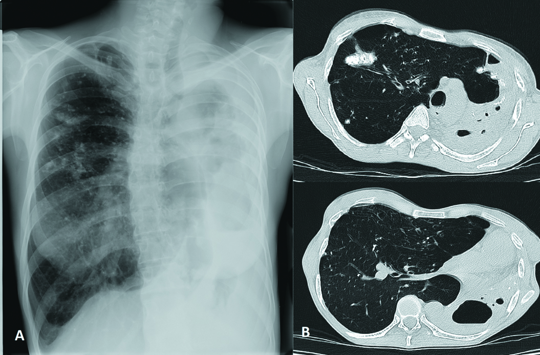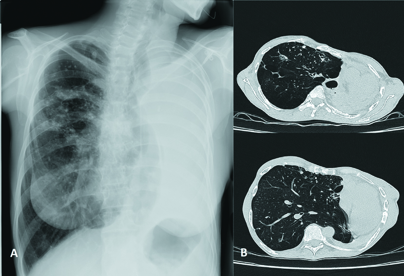 Figure 1. X-Ray (A) and CT of the chest organs (B) at admission, where A – displacement of the mediastinal organs (trachea, heart) to the left; B – large upper anterior pulmonary hernia, large foсus in S2 of the right lung, destroyed left lung.