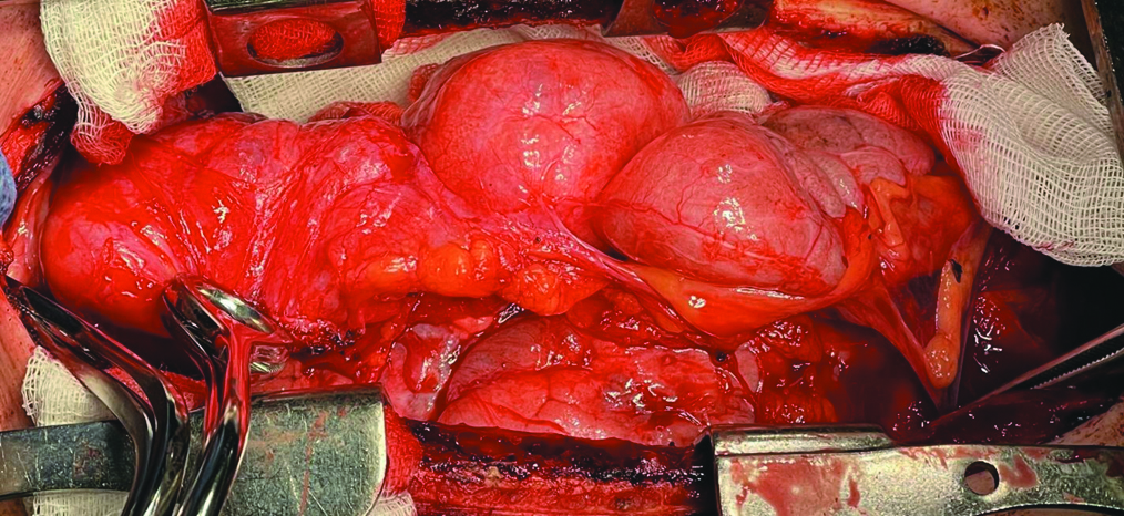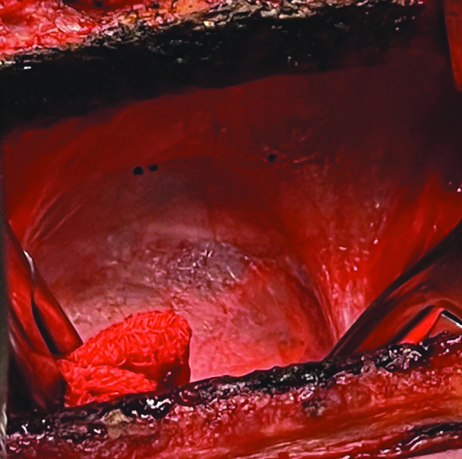 Surgery was performed on 02.06.2021: trans-sternal occlusion of the left major bronchus with simultaneous reconstruction of the anterior mediastinum with polymer mesh implant. The stages of the surgery are shown in Figures 2–6.