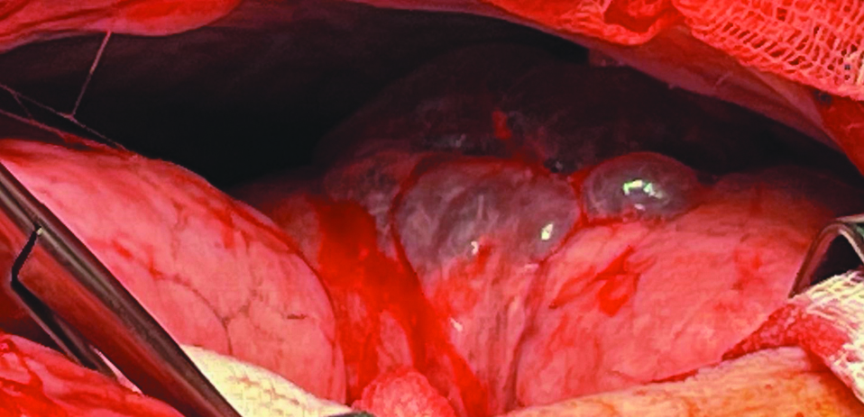 Process of the surgery. After the longitudinal sternotomy, a large size pulmonary hernia of the right lung was visualized (Fig. 2).