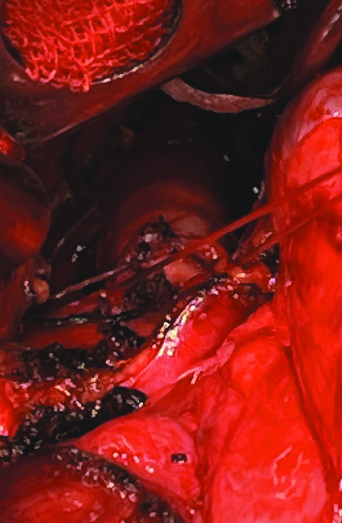 In the aorto-caval space, the left main bronchus is identified (Fig. 5) and traversed, the trachebronchial defect is reconstructed with single interrupted sutures.