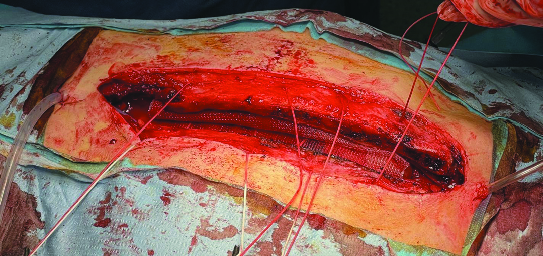 Figure 6. Installation of a mesh implant on the right intrapleurally on the right: stitching with dacron threads to the sternum when access is closed.