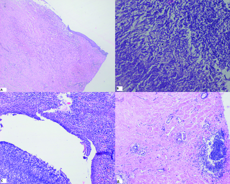 Figure 7. Histological picture of the surgical material: 7A – the wall of the chronic cavity, staining with hematoxylin and eosin, x 40.; 7B – multiple hyphae of the fungus Aspergillus in necrotic masses in the lumen of the cavity, staining with hematoxylin and eosin, x 200.; 7C – multiple hyphae of the fungus Aspergillus in necrotic masses in the lumen of the cavity, staining with hematoxylin and eosin, x 100.; 7D – a focus of fibrosis in the lung tissue, staining with hematoxylin and eosin, x 100.