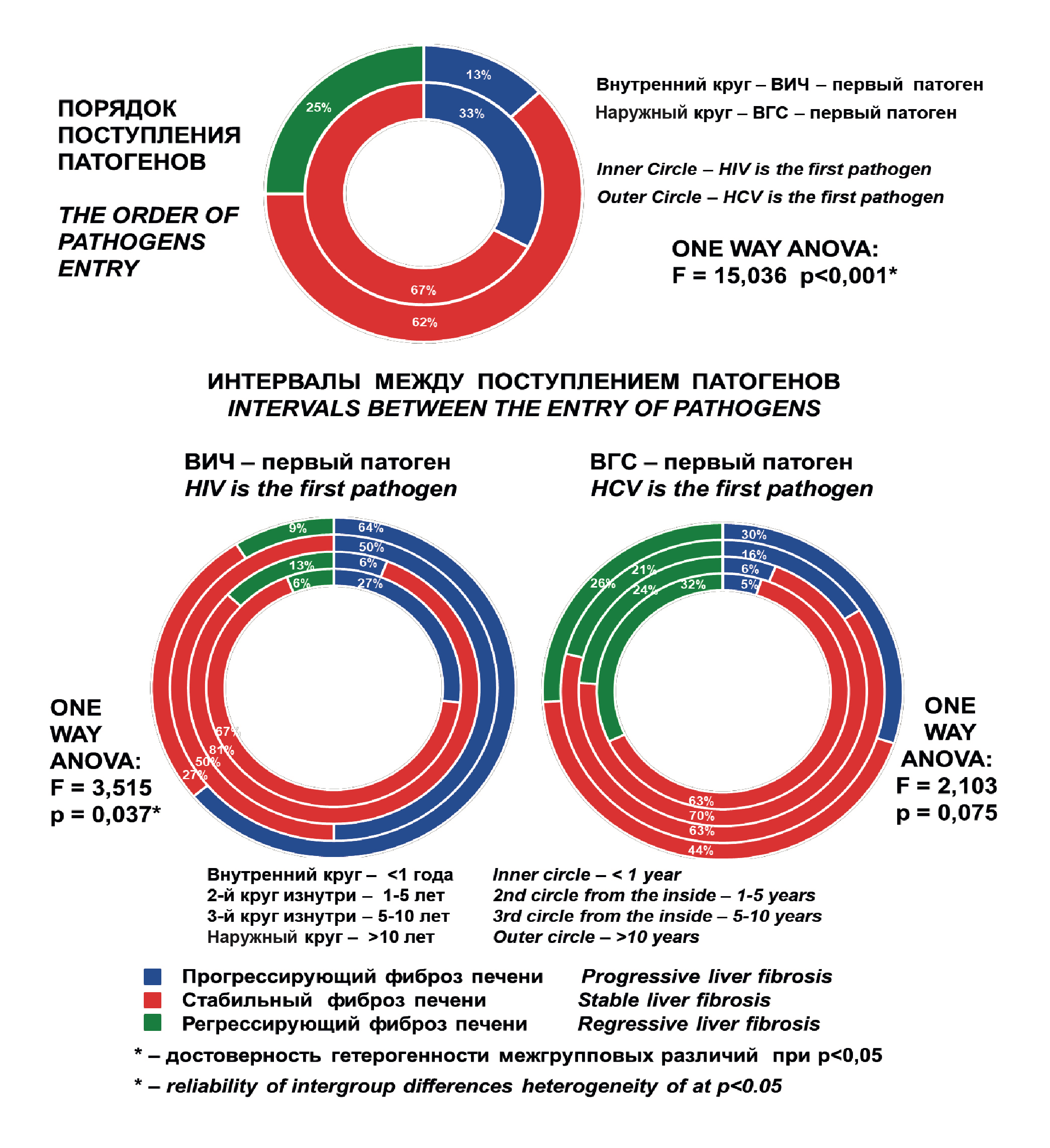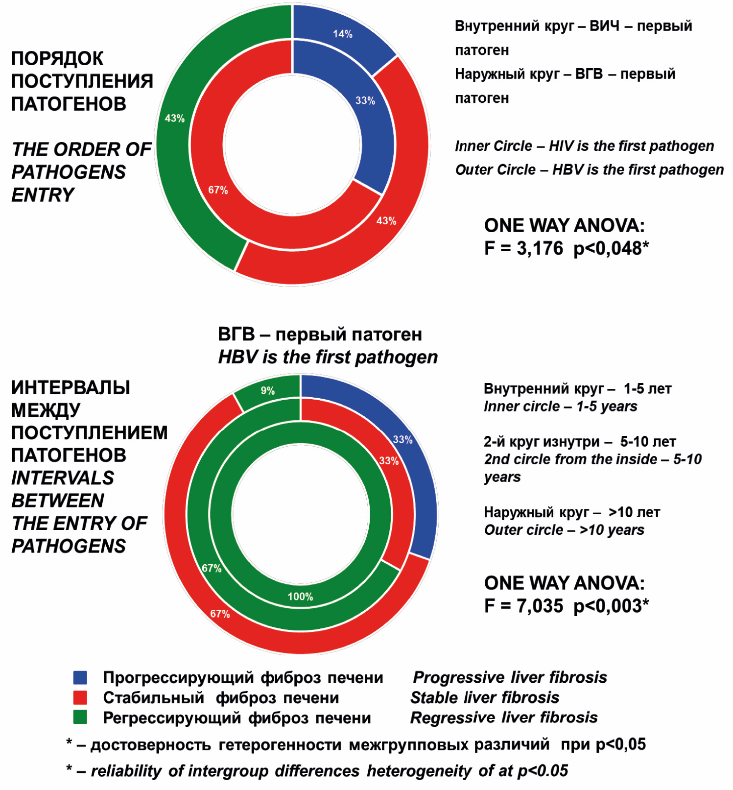 Рисунок 3. Взаимосвязь между порядком и интервалами поступления в организм хозяина патогенов при коинфекции ВИЧ/ВГВ и характером течения фиброза печени.