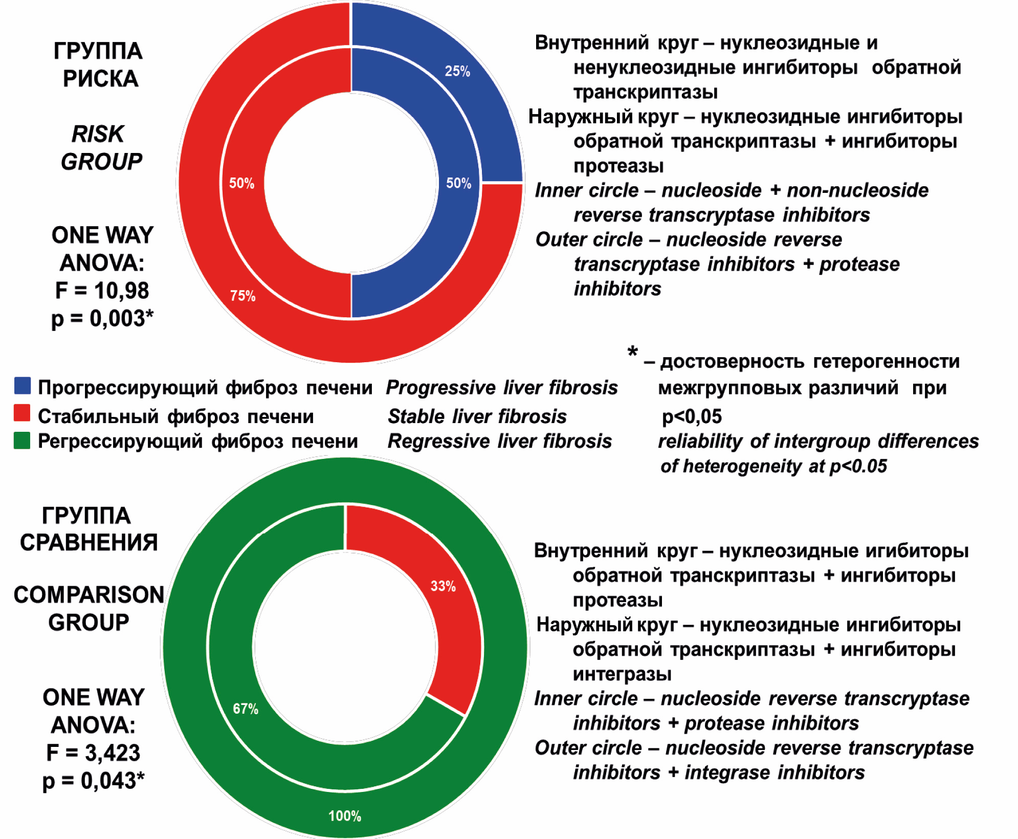 В группе сравнения (12 человек) реакция на антиретровирусную терапию была совершенно иной, хотя анализу подвергались противофиброзное действие той же схемы, что и в группе риска (нуклеозидные ингибиторы обратной транскриптазы и ингибиторы протеазы), а также схемы, включающей комбинацию нуклеозидных ингибиторов обратной транскриптазы и ингибиторов интегразы. Обе схемы не показывали сочетания с прогрессирующим течением фиброзного процесса в печени при явной склонности к регрессирующему течению. Более того, при комбинации нуклеозидных ингибиторов обратной транскриптазы и ингибиторов интегразы регресс фиброзных изменений отмечался у всех трех человек, получавших эти препараты.