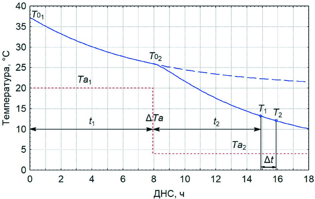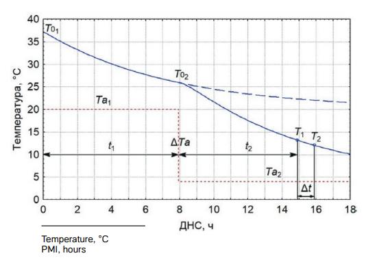 where Та2 – final ambient temperature, °С; t2 – duration of the final period of cooling, h; Т1 – CT in the first thermometry of the corpse in the end of t2 period, °С; Т2 – CT in the second thermometry of the corpse, °С; Δt – time between the thermometries of the corpse, h (Fig. 1).