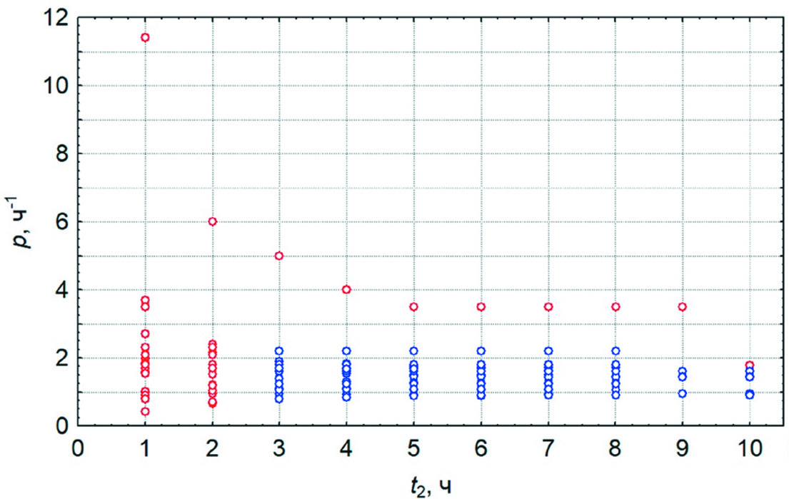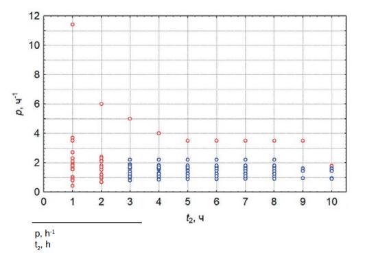 The values of the р constant in the first two hours of the final cooling period, as well as with the difference ΔTa of the initial and the final temperatures below 6 °С also demonstrated marked dispersion, whereas in other options of the studies cooling conditions the distribution of values of the constant was uniform with the average value being 1.4 h-1 and maximum deviation from the average at 0.8 h-1 (Fig. 3).